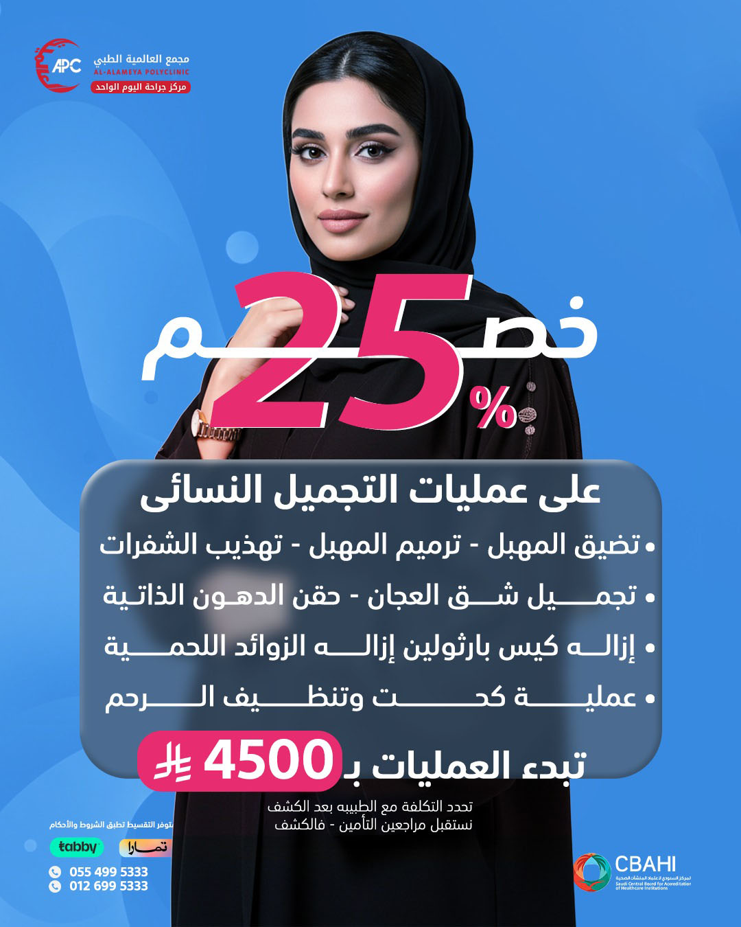 خدمات قسم التجميل النسائي للمنطقة الحساسه بمركز جراحة اليوم الواحد الدكتورة ابتهال التوم - استشارية النسا والتوليد والتجميل النسائي - الكشف 150 ريال - الكشف 150 ريال - خصم 25 % على عمليات التجميل النسائي الان يمكنك تقسيط قيمه العملية بكل سهولة تطبق الشروط والاحكام - الفيديوهات اضغط هنا عملية تضييق المهبل تبدء من 4500 ريال وتحديد التكلفة مع الطبيبة بعد الكشف يحسب من داخل قيمة العملية عند الاستفادة من العملية - - عملية تجميل الشفرات تبدء من 4500 ريال وتحديد التكلفة مع الطبيبة بعد الكشف الاجراءات التجميلية للمنطقة الحساسه مثل تفتيح المنطقة الحساسه حقن البلاما حقن الفيلر وتوريد منطقة البيكينى تحدد التكلفة بعد معاينة الحاله تعبئة البكيني بالفيلر يعمل على تفتيح التصبغات الداكنة في المنطقة الحساسة ومنحها مظهرًا أكثر شبابًا كما يؤدي إلى تحسين الحجم وتنعيم الملمس هذا الإجراء لملء وشد الجلد وتحسين مرونته يمنحك مظهرًا أكثر جمالًا وتناسقً - - - - - - - - اازاله جميع الثأليل بالمنطقه الحساسه تحت التخدير & اجراء حقن قناه فالوب بالصبغه لمعالجه الانسداد وانقطاع الحمل - عمليات ترميم كامل لمهبل عمليات الترميم الكاملة للمهبل يكون التجميل عند ارتخاء عضلات المهبل أو حدوث تغيرات في المهبل والأجزاء المحيطة بها (كالشفرات وغيرها) التي تحدث بسبب تكرار عملية الولادة التي قد تؤدي إلى تأثر العلاقة بين الشريكين التجميل النسائي بالحقن والاجراءت الموضعية تقنيات تفتيح ونضارة وتعبئه المنطقة الحساسه حقن البلازما للمنطقه الحساسه لأعادة شبابها وإحساسها علاج الترهل و الارتخاء لمنطقة البيكنى في فترة ما بعد الانجاب علاج مشاكل فتور العلاقة الحميمة علاج الم الاتصال الجنسي إزالة الثأليل الزائدة بالمنطقة الحساسه تقنيات الحقن لاعادة تشكيل و تجميل المنطقة الحميمة العناية بالمنطقة الحساسة وتفتيحها وتوريدها إزالة الثأليل الزائدة بالمنطقة وبعنق الرحم تقنيات الحقن لعلاج التشنجات المهبلية اللاارادية تقنيات الحقن لعلاج سلس البول الجهدي صحة المراة متابعة الحمل الولادات الطبيعية والقيصرية علاج الأمراض النسائية المختلفة استشارات و نصائح لصحة المراة قبل الحمل الاستشارة في استخدام وسائل تنظيم الحمل تركيب اللولب و تركيب شريحة منع الحمل استشارات و علاج اعراض مرحلة سن انقطاع الطمث استشارات و نصائح لصحة المراة في سن انقطاع الطمث اجراء الفحوصات للمراة في سن انقطاع الطمث اجراء الفحوصات الدورية لعنق الرحم استشارات و نصائح لتحسين نمط حياة المراة و المحافظة على صحة المراة ملاحظة مهمه للنساء يجب إجراء الکشف على المريضه اولا بالعياده لتحديد ما تحتاجه وما هو المناسب لحالتها والاكثر فائده لها فى عمليات التجميل النسائى او تفتيح المنطقه الحساسه