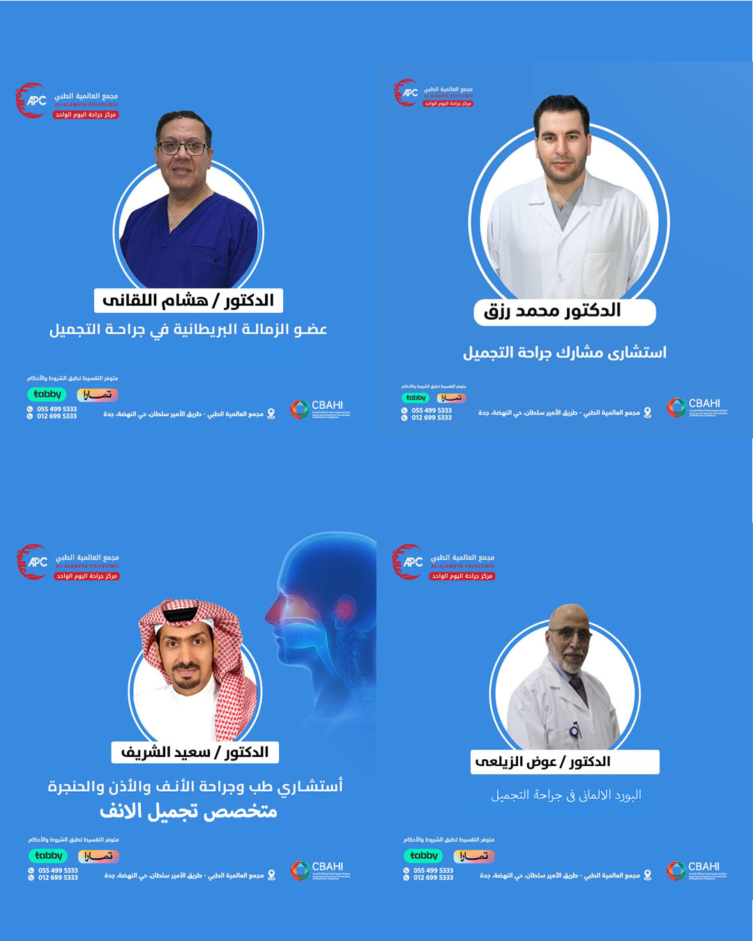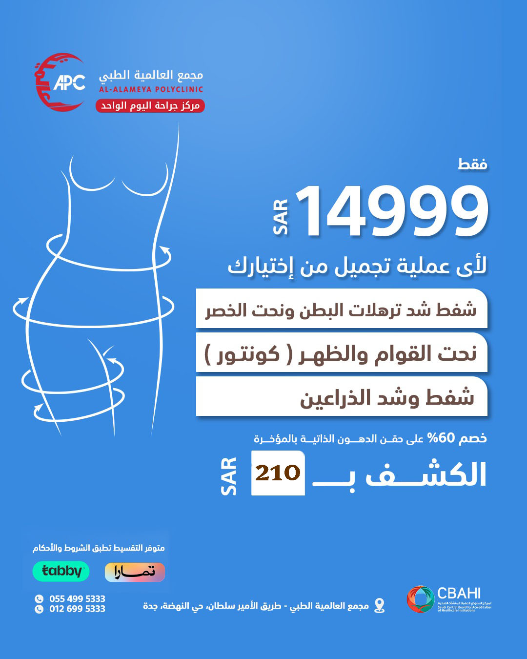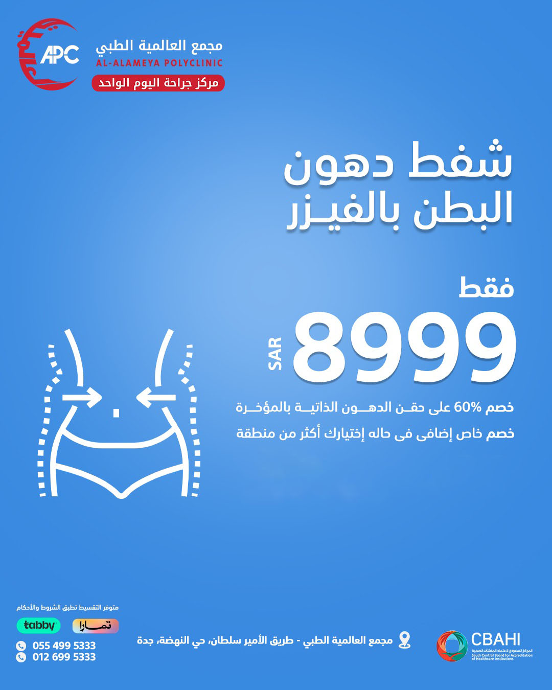 خدمات جراحة التجميل الدكتور / محمد رزق - استشارى مشـارك جراحة التجميـل الكشف 200 ريال بمناسبة العام الجديد استشارة طبية مجانية عبر الطب الاتصالى يومى الثلاثاء والخميس من الساعه 06 مساء الى الساعه 07 مساء خصم 60%على اجراء حقن الدهون الذاتية لتعبئة وتكبير الارداف (المؤخرة ) خصم إضافى عند إختيارك أكثر من اجراء يتوفر الكشف اونلاين - الدكتور / عوض الزيلعى - استشارى جراحة التجميـل الكشف 200 ريال - الدكتور / هشام اللقانى - استشارى مشـارك جراحة التجميـل الكشف 200 ريال بمناسبة العام الجديد استشارة طبية مجانية عبر الطب الاتصالى يومى الثلاثاء والخميس من الساعه 06 مساء الى الساعه 07 مساء - الدكتور / سعيد الشريف - استشارى طب وجراحة الانف والاذن والحنجرة متخصص تجميل انف الكشف 210 ريال - فى قسم جراحة تجميل الانف الشهادات والمؤهلات العلمية: 1. دبلوم القيادة الإكلينيكية - جامعة الجراحين الملكية، أيرلندا. 2. الزمالة البلجيكية في طب وجراحة الأنف والجيوب الأنفية وجراحة قاع الجمجمة. 3. الزمالة الأوروبية في طب وجراحة الأنف والأذن والحنجرة والرأس والعنق. 4. الزمالة العربية في طب وجراحة الأنف والأذن والحنجرة والرأس والعنق. 5. الزمالة السعودية في طب وجراحة الأنف والأذن والحنجرة والرأس والعنق. يتوفر الكشف اون لاين (الطب الاتصالى ) من خلال تطبيق الزووم - توفر حقنة تاب بلوك مجانى بعد العمليات - شفط الدهون لمنطقة البطن 7999 ريال ويحدد الاستفادة من العرض الطبيب بعد معاينه الحاله خصم 60% على اجراء حقن الدهون الذاتية لتتعبئة وتكبير الارداف ( المؤخرة ) خصم إضافى عند إختيارك أكثر من اجراء يتوفر الكشف اونلاين امكانية حقن الدهون الذاتية لتكبير المؤخرة فى حاله الرغبة خصم 60% على خدمة حقن الدهون - شفط الدهون لمنطقة الظهر 7999 ريال ويحدد الاستفادة من العرض الطبيب بعد معاينة الحاله - شفط الدهون منطقه الذراعين ( الزنود ) 7999 ريال ويحدد الاستفادة من العرض الطبيب بعد معاينة الحاله - شفط الدهون منطقه الفخذين 10999 ريال ويحدد الاستفادة من العرض الطبيب بعد معاينة الحاله - شد ترهلات البطن 13999 ريال - عملية التثدى عند الرجال 6999 ريال للدرجة الاولى والثانية شامل الكشف والفحوصات والعملية ومتابعات بعد العملية تحديد التكلفة مع الطبيب بعد معاينه الحاله - عملية شفط اللغلوغ 4999 ريال - خصم 30 % على عمليات تجميل الثدي عند النساء وتحدد التكلفه مع الطبيب بعد الكشف - امكانية حقن الدهون الذاتية لتكبير المؤخرة فى حاله الرغبة خصم 60% على خدمة حقن الدهون - شفط وشد ترهلات البطن 14999 ريال - شامل الكشف وفحوصات قبل العملية والعملية ومتابعات بعد العملية - عملية شفط اللغلوغ 4999 ريال - عملية تكبير الثدي خصم 30% عملية تجميل الثدي وتشمل تصغير الثدي وشد ورفع الثدي خصم 30% - - ــ خدمات العيادة ــ - شفط الدهون ونحت القوام بجهاز الفيزرمع إمكانية حقن الدهون بالمؤخرة للنساء فقط - شفط وشد البطن وترهلات الجسم بعد عمليات التكميم وانقاص الوزن او الولادات المتكررة للنساء تجميل الثديين (شد ورفع – تصغير) علاج واستئصال التثدي عند الرجال شفط دهون و شد الذراعين شفط دهون و شد الفخذين عملية اللغلوغ ( ازالة الذقن المزدوج ) تجميل الانف و تصغير الانف تجميل جفون العين السفلية او العلوية إصلاح الشفة الأرنبيه إصلاح سقف الحلق المشقوق إصلاح الاذن البارزه او الاذن الواطواطية علاج التشوهات الناتجة عن الحروق والعمليات الجراحية تصليح العيوب الخلقية عند الأطفال الهدف من عملية شفط الدهون اضغط هنا