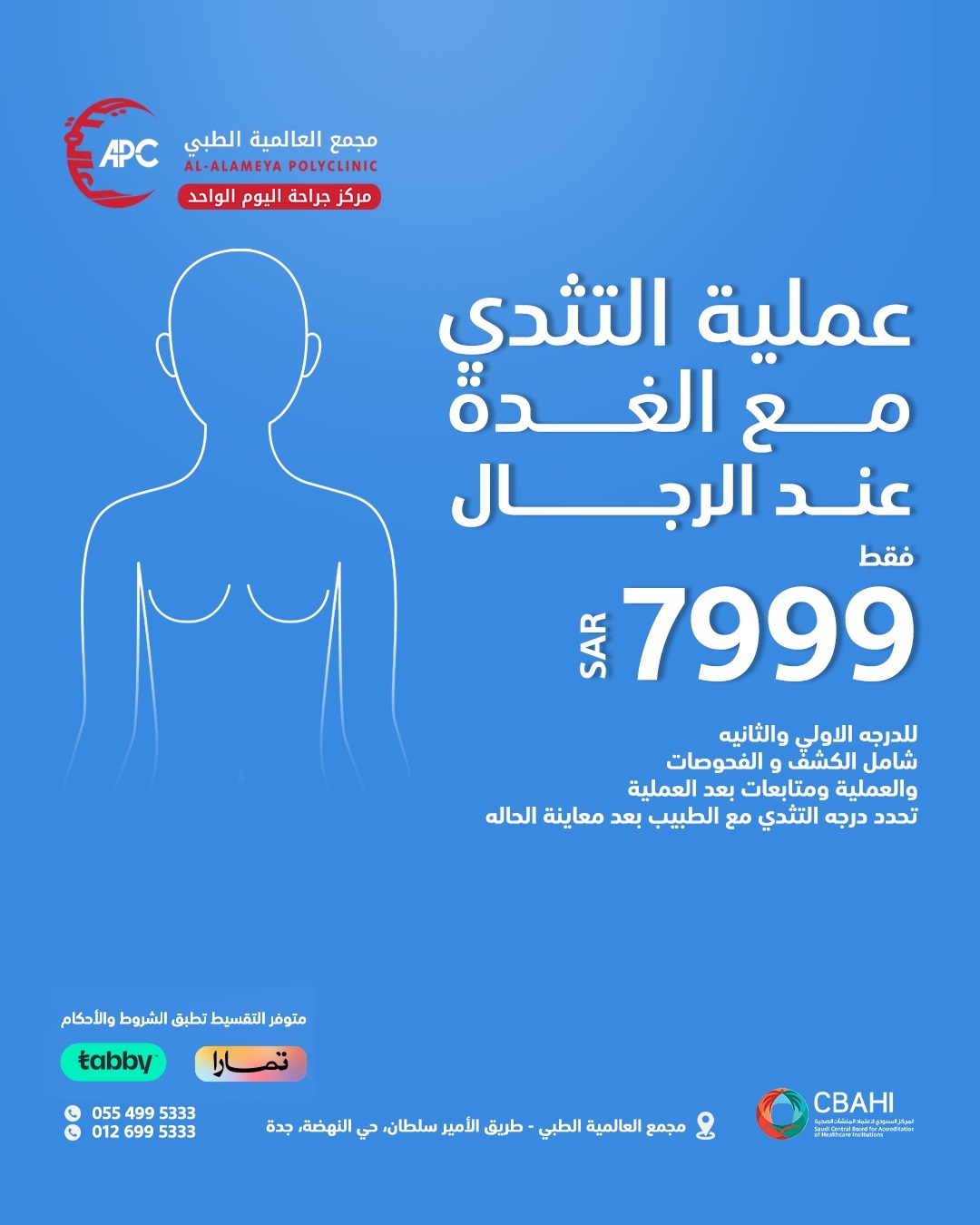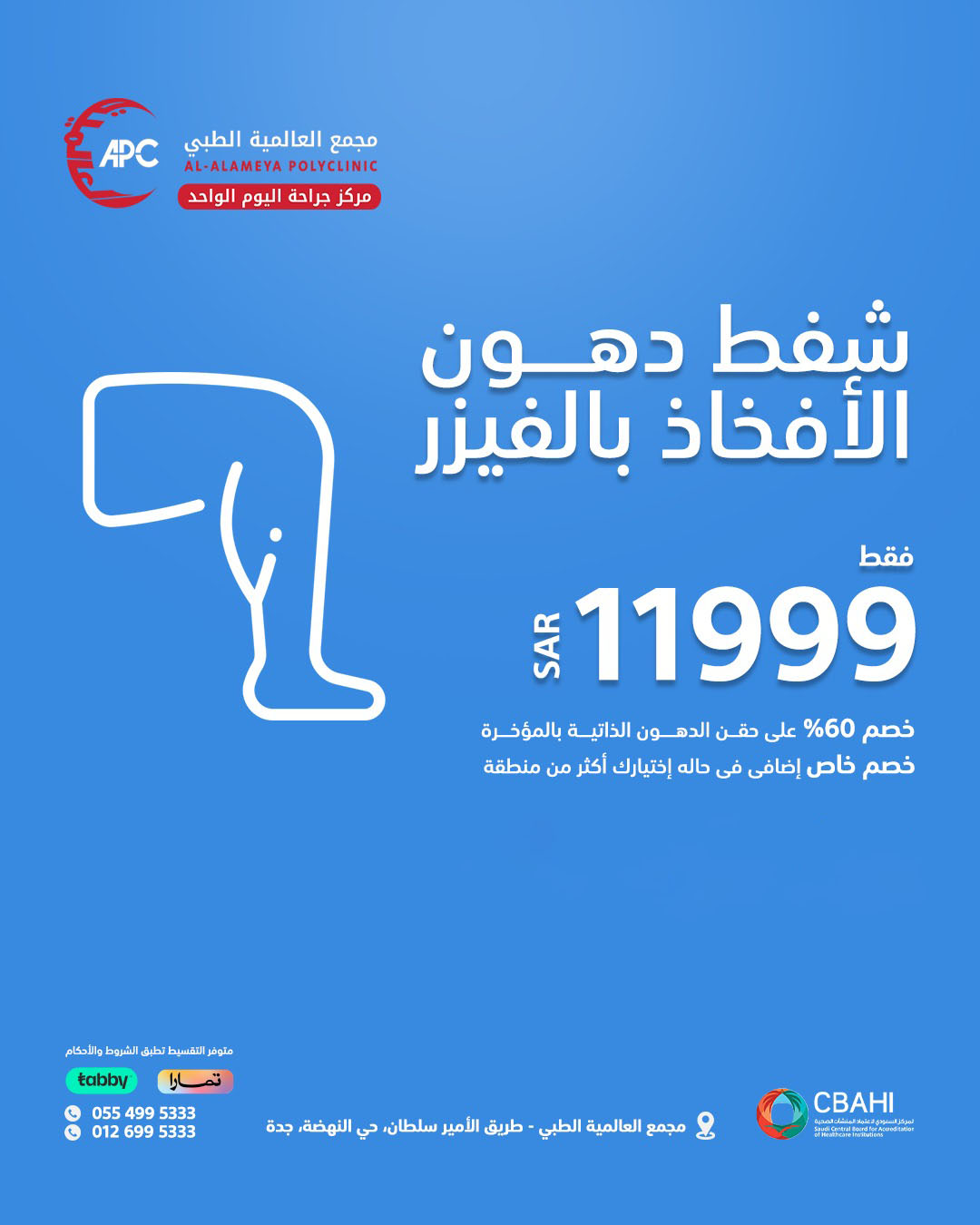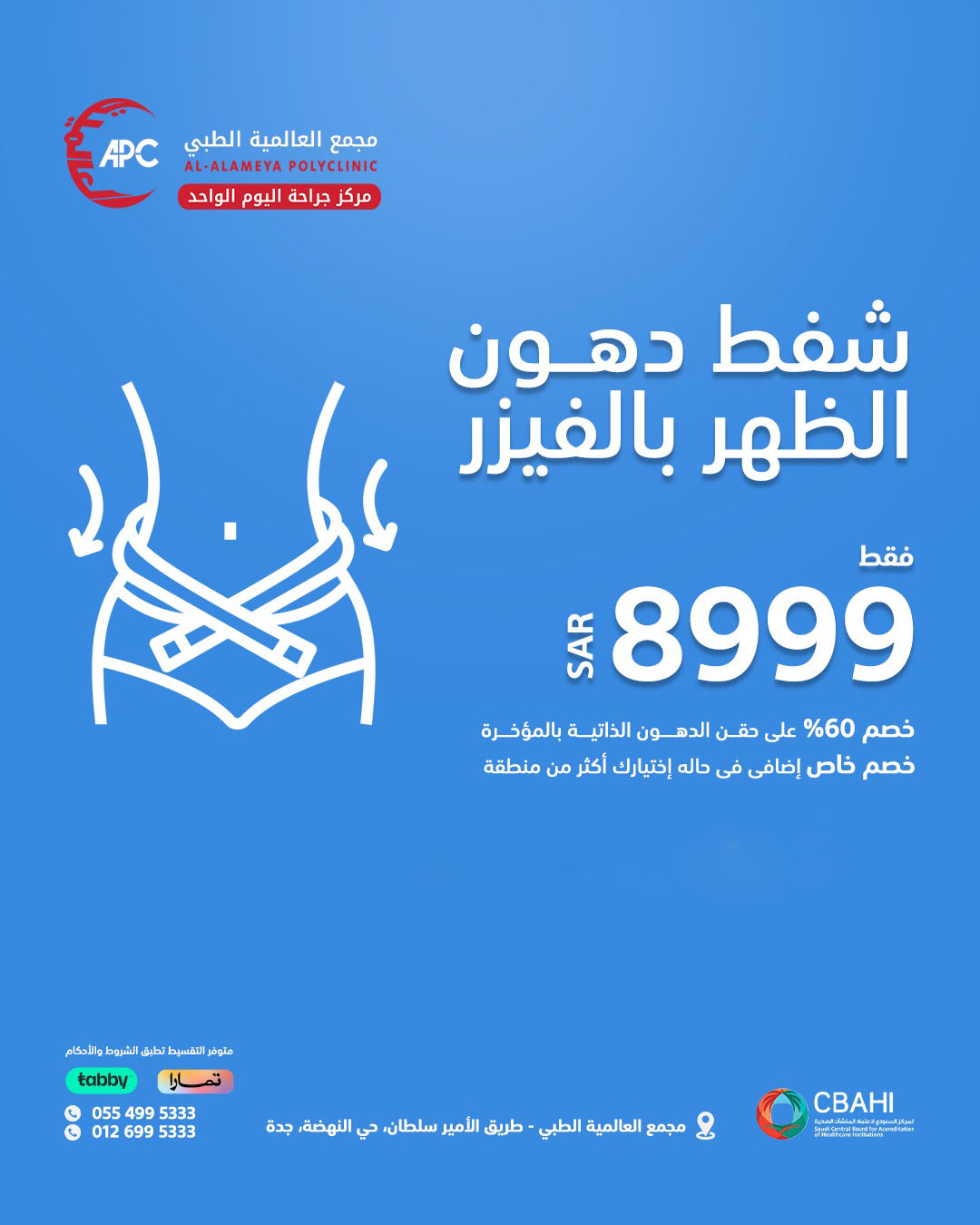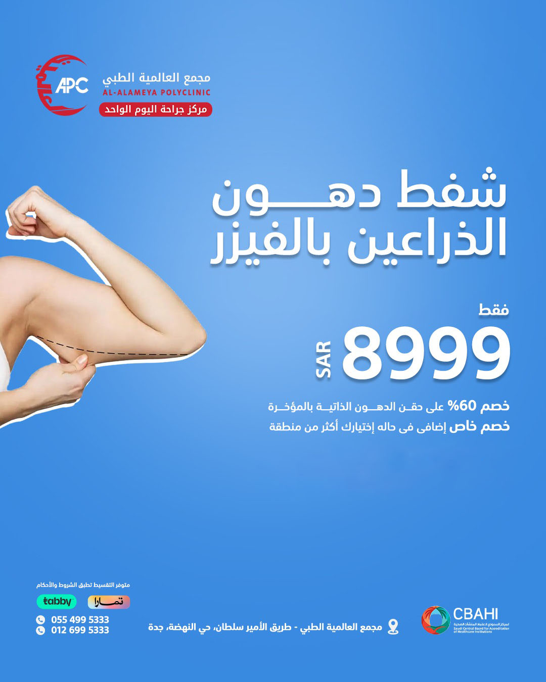 خدمات جراحة التجميل الدكتور / محمد رزق - استشارى مشـارك جراحة التجميـل الكشف 200 ريال بمناسبة العام الجديد استشارة طبية مجانية عبر الطب الاتصالى يومى الثلاثاء والخميس من الساعه 06 مساء الى الساعه 07 مساء خصم 60%على اجراء حقن الدهون الذاتية لتعبئة وتكبير الارداف (المؤخرة ) خصم إضافى عند إختيارك أكثر من اجراء يتوفر الكشف اونلاين - الدكتور / عوض الزيلعى - استشارى جراحة التجميـل الكشف 200 ريال - الدكتور / هشام اللقانى - استشارى مشـارك جراحة التجميـل الكشف 200 ريال بمناسبة العام الجديد استشارة طبية مجانية عبر الطب الاتصالى يومى الثلاثاء والخميس من الساعه 06 مساء الى الساعه 07 مساء - الدكتور / سعيد الشريف - استشارى طب وجراحة الانف والاذن والحنجرة متخصص تجميل انف الكشف 210 ريال - فى قسم جراحة تجميل الانف الشهادات والمؤهلات العلمية: 1. دبلوم القيادة الإكلينيكية - جامعة الجراحين الملكية، أيرلندا. 2. الزمالة البلجيكية في طب وجراحة الأنف والجيوب الأنفية وجراحة قاع الجمجمة. 3. الزمالة الأوروبية في طب وجراحة الأنف والأذن والحنجرة والرأس والعنق. 4. الزمالة العربية في طب وجراحة الأنف والأذن والحنجرة والرأس والعنق. 5. الزمالة السعودية في طب وجراحة الأنف والأذن والحنجرة والرأس والعنق. يتوفر الكشف اون لاين (الطب الاتصالى ) من خلال تطبيق الزووم - توفر حقنة تاب بلوك مجانى بعد العمليات - شفط الدهون لمنطقة البطن 7999 ريال ويحدد الاستفادة من العرض الطبيب بعد معاينه الحاله خصم 60% على اجراء حقن الدهون الذاتية لتتعبئة وتكبير الارداف ( المؤخرة ) خصم إضافى عند إختيارك أكثر من اجراء يتوفر الكشف اونلاين امكانية حقن الدهون الذاتية لتكبير المؤخرة فى حاله الرغبة خصم 60% على خدمة حقن الدهون - شفط الدهون لمنطقة الظهر 7999 ريال ويحدد الاستفادة من العرض الطبيب بعد معاينة الحاله - شفط الدهون منطقه الذراعين ( الزنود ) 7999 ريال ويحدد الاستفادة من العرض الطبيب بعد معاينة الحاله - شفط الدهون منطقه الفخذين 10999 ريال ويحدد الاستفادة من العرض الطبيب بعد معاينة الحاله - شد ترهلات البطن 13999 ريال - عملية التثدى عند الرجال 6999 ريال للدرجة الاولى والثانية شامل الكشف والفحوصات والعملية ومتابعات بعد العملية تحديد التكلفة مع الطبيب بعد معاينه الحاله - عملية شفط اللغلوغ 4999 ريال - خصم 30 % على عمليات تجميل الثدي عند النساء وتحدد التكلفه مع الطبيب بعد الكشف - امكانية حقن الدهون الذاتية لتكبير المؤخرة فى حاله الرغبة خصم 60% على خدمة حقن الدهون - شفط وشد ترهلات البطن 14999 ريال - شامل الكشف وفحوصات قبل العملية والعملية ومتابعات بعد العملية - عملية شفط اللغلوغ 4999 ريال - عملية تكبير الثدي خصم 30% عملية تجميل الثدي وتشمل تصغير الثدي وشد ورفع الثدي خصم 30% - - ــ خدمات العيادة ــ - شفط الدهون ونحت القوام بجهاز الفيزرمع إمكانية حقن الدهون بالمؤخرة للنساء فقط - شفط وشد البطن وترهلات الجسم بعد عمليات التكميم وانقاص الوزن او الولادات المتكررة للنساء تجميل الثديين (شد ورفع – تصغير) علاج واستئصال التثدي عند الرجال شفط دهون و شد الذراعين شفط دهون و شد الفخذين عملية اللغلوغ ( ازالة الذقن المزدوج ) تجميل الانف و تصغير الانف تجميل جفون العين السفلية او العلوية إصلاح الشفة الأرنبيه إصلاح سقف الحلق المشقوق إصلاح الاذن البارزه او الاذن الواطواطية علاج التشوهات الناتجة عن الحروق والعمليات الجراحية تصليح العيوب الخلقية عند الأطفال الهدف من عملية شفط الدهون اضغط هنا