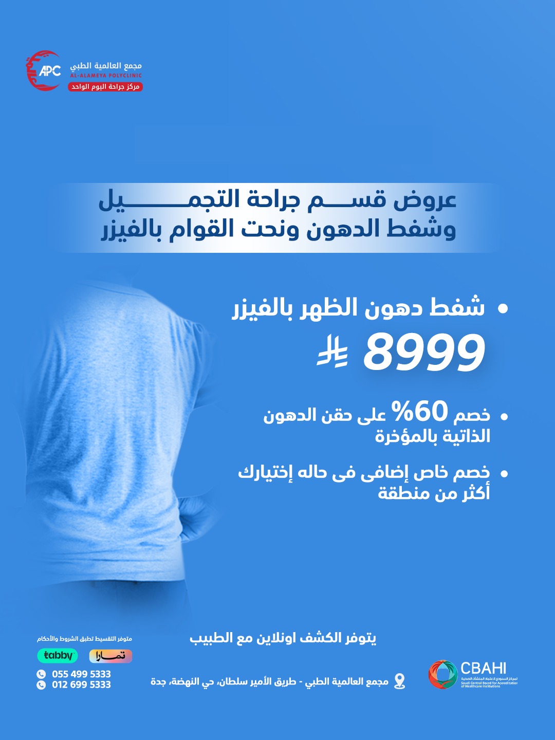 شفط الدهون لمنطقة الظهر 8999 ريال ويحدد الاستفادة من العرض الطبيب بعد معاينة الحاله