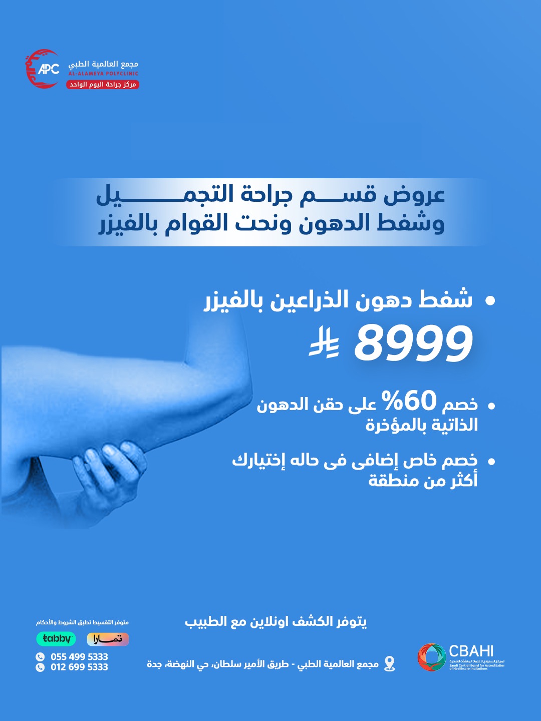 شفط الدهون منطقه الذراعين ( الزنود ) 8999 ريال ويحدد الاستفادة من العرض الطبيب بعد معاينة الحاله
