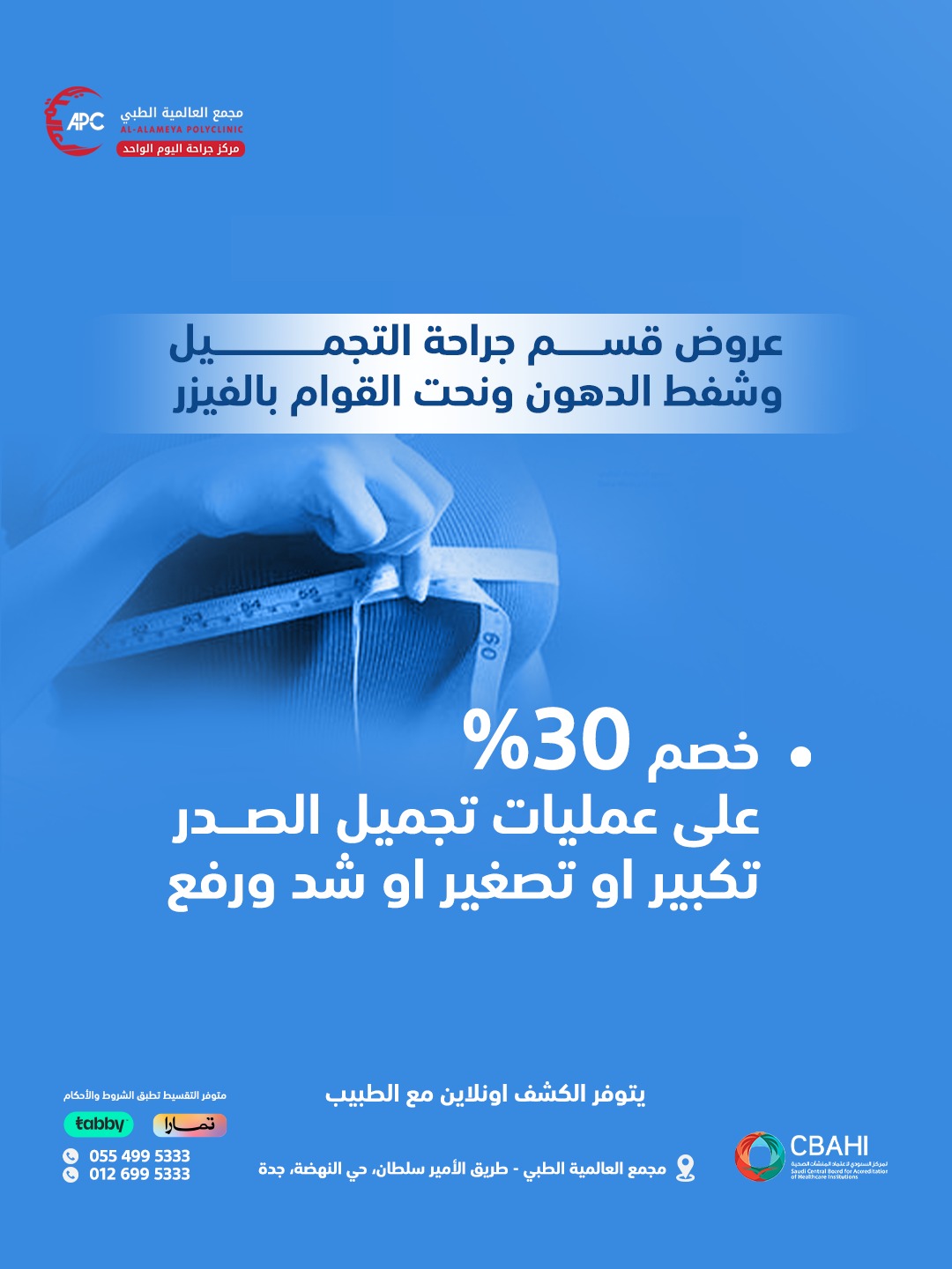 خصم 30 % على عمليات تجميل الثدي عند النساء وتحدد التكلفه مع الطبيب بعد الكشف