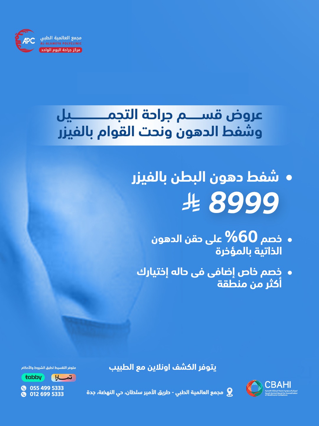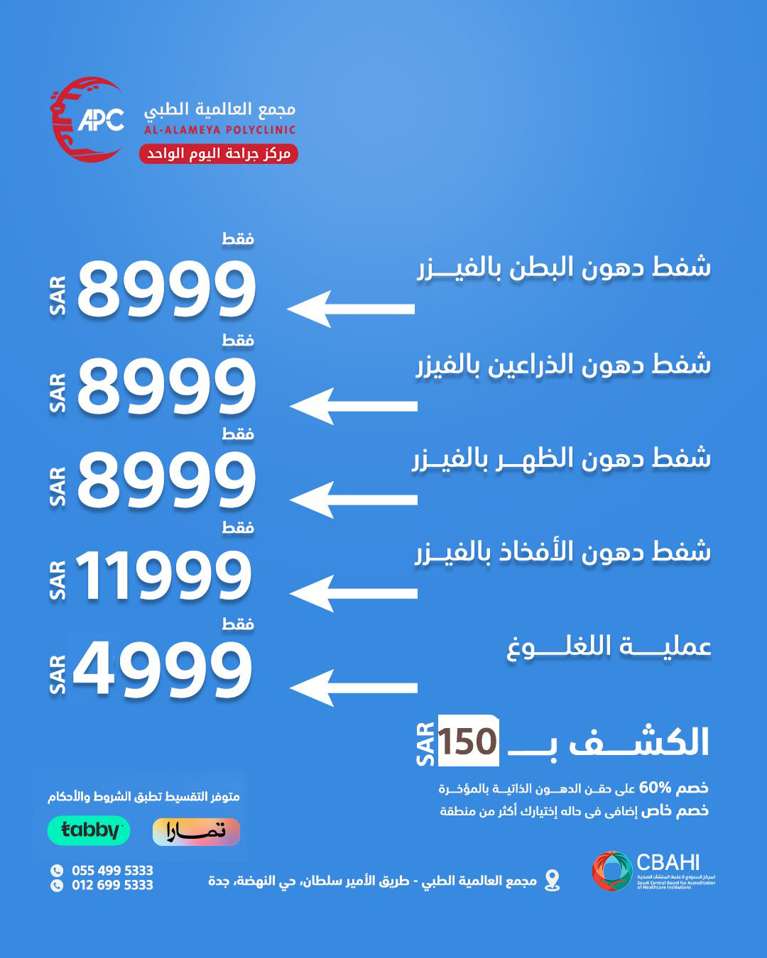 شفط دهون البطن بالفيزر 8999 ريال خصم 60% على حقن الدهون الذاتية بالمؤخرة