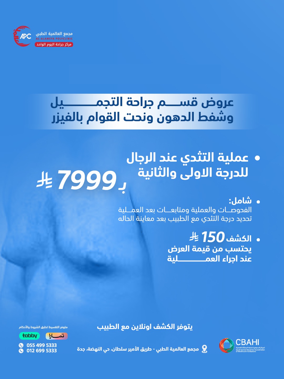 عملية التثدي عند الرجال للدرجة الاولى والثانية بـ 7999 ريال شامل الفحوصات والعملية ومتابعات بعد العملية